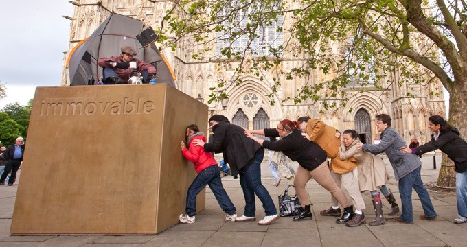 What would happen if a six-foot cube of Yorkshire Stone appeared without explanation, one morning in a public place in the middle of your City? Immovable is a playful, interactive installation that inspires passion, performance, curiosity, extreme sports and laughter.